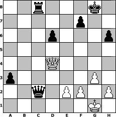 Partie-Notation im PGN-Format [Event "Winter 19/20"] [Site "www.mySchach.de"] [Date "2020.01.09"] [Round "1"] [White "miu"] [Black "Joschi"] [ECO "A56"] [WhitemyELO "1548"] [BlackmyELO "1598"] [Result "0-1"] [TimeControl "10/2592000"] [WhiteDays "119"] [BlackDays "120"] [MySchachNr "116860"] 1. d4 Nf6 2. c4 c5 3. Nf3 g6 4. g3 Bg7 5. Bg2 O-O 6. O-O cxd4 7. Nxd4 Nc6 8. Nc3 Nxd4 9. Qxd4 d6 10. Rd1 a6 11. Bg5 h6 12. Bxf6 Bxf6 13. Qd2 Rb8 14. Nd5 Bg7 15. Qe3 Be6 16. Nb6 Bxb2 17. Rab1 Bg7 18. c5 Qc7 19. cxd6 exd6 20. Rdc1 Qe7 21. Nd5 Qd8 22. Nf4 Bxa2 23. Rxb7 Rxb7 24. Bxb7 a5 25. Qa3 Qb6 26. Qxa2 Qxb7 27. Nxg6 Ra8 28. Nf4 a4 29. Rc4 a3 30. Nh5 Qb2 31. Rc2 Qxc2 32. Qd5 Rc8 33. Nxg7 Kxg7 34. Qd4+ Kg8 0-1 Stellungs-Notation im FEN-Format 2r3k1/5p2/3p3p/8/3Q4/p5P1/2q1PP1P/6K1 - - - 2 35 Geschlagene Figuren Weiss: Geschlagene Figuren Schwarz: Klicken Sie auf eine geschlagene Figur um den gewünschten Zug darzustellen!