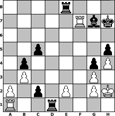 Partie-Notation im PGN-Format [Event "Sommer"] [Site "www.mySchach.de"] [Date "2015.07.14"] [Round "1"] [White "Geisterreiter"] [Black "Achimkogge"] [ECO "C21"] [WhitemyELO "1411"] [BlackmyELO "1500"] [Result "0-1"] [TimeControl "10/1728000"] [WhiteDays "77"] [BlackDays "78"] [MySchachNr "99695"] 1. e4 e5 2. d4 Nc6 3. Bc4 exd4 4. Qf3 Ne5 5. Qb3 Nxc4 6. Qxc4 c5 7. Nf3 Nf6 8. Ng5 Qe7 9. Nd2 h6 10. Nxf7 Qxf7 11. Qxf7+ Kxf7 12. O-O d6 13. Nf3 Nxe4 14. Bf4 Bf5 15. Rad1 g5 16. Bg3 Nxg3 17. fxg3 Re8 18. Ne1 Kg6 19. Rf2 Bg7 20. h3 h5 21. Nf3 g4 22. Nh4+ Kh7 23. Nxf5 Be5 24. Kh2 Rhf8 25. h4 b5 26. b3 b4 27. Re1 Rf6 28. Ra1 d3 29. Nxd6 Rxd6 30. Rf7+ Bg7 31. Rxa7 dxc2 32. Rf7 Rd1 0-1 Stellungs-Notation im FEN-Format 4r3/5Rbk/8/2p4p/1p4pP/1P4P1/P1p1P1PK/R2r4 - - - 2 33 Geschlagene Figuren Weiss: Geschlagene Figuren Schwarz: Klicken Sie auf eine geschlagene Figur um den gewünschten Zug darzustellen!