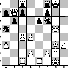 Partie-Notation im PGN-Format [Event "Das Letzte vom "Chef""] [Site "www.mySchach.de"] [Date "2008.12.01"] [Round "1"] [White "wasserandy"] [Black "MStr"] [ECO "D06"] [WhitemyELO "1687"] [BlackmyELO "1428"] [Result "1-0"] [TimeControl "10/2592000"] [WhiteDays "30"] [BlackDays "28"] [MySchachNr "50325"] 1. d4 d5 2. c4 Bf5 3. Nc3 dxc4 4. e4 Bg6 5. Bxc4 e6 6. Nf3 Bb4 7. Bd3 Nf6 8. O-O O-O 9. a3 Bxc3 10. bxc3 Bxe4 11. Bxe4 Nxe4 12. Qb3 b6 13. Re1 Nf6 14. Bg5 h6 15. Bh4 g5 16. Bg3 Qd5 17. c4 Qb7 18. h3 Nc6 19. Rac1 Na5 20. Qe3 Rac8 21. Nxg5 hxg5 22. Qxg5+ 1-0 Stellungs-Notation im FEN-Format 2r2rk1/pqp2p2/1p2pn2/n5Q1/2PP4/P5BP/3P1PP1/2R1R1K1 - - - 0 22 Geschlagene Figuren Weiss: Geschlagene Figuren Schwarz: Klicken Sie auf eine geschlagene Figur um den gewünschten Zug darzustellen!