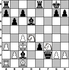 Partie-Notation im PGN-Format [Event "Abermals Aljechin"] [Site "www.mySchach.de"] [Date "2011.02.13"] [Round "2"] [White "Joschi"] [Black "woern63"] [ECO "A52"] [WhitemyELO "1447"] [BlackmyELO "1845"] [Result "0-1"] [TimeControl "10/1728000"] [WhiteDays "48"] [BlackDays "60"] [MySchachNr "71990"] 1. d4 Nf6 2. c4 e5 3. dxe5 Ng4 4. e4 d6 5. exd6 Bxd6 6. Be2 Nf6 7. Qc2 O-O 8. Nf3 Re8 9. Nbd2 b6 10. O-O Bb7 11. Bd3 Na6 12. a3 Nc5 13. Re1 Nxd3 14. Re3 Nxf2 15. Kxf2 Ng4+ 16. Ke2 Nxe3 17. Kxe3 f5 18. Kf2 fxe4 19. Nd4 Qh4+ 20. Ke2 e3 21. N2f3 Qf2+ 22. Kd3 Be4+ 23. Kc3 Bxc2 0-1 Stellungs-Notation im FEN-Format r3r1k1/p1p3pp/1p1b4/8/2PN4/P1K1pN2/1Pb2qPP/R1B5 - - - 0 24 Geschlagene Figuren Weiss: Geschlagene Figuren Schwarz: Klicken Sie auf eine geschlagene Figur um den gewünschten Zug darzustellen!