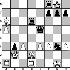 Partie-Notation im PGN-Format [Event "Bremer Schl"] [Site "www.mySchach.de"] [Date "2008.11.01"] [Round "2"] [White "Phantasos"] [Black "larlinde"] [ECO "A46"] [WhitemyELO "2124"] [BlackmyELO "2207"] [Result "0-1"] [TimeControl "10/2592000"] [WhiteDays "00"] [BlackDays "65"] [MySchachNr "49463"] 1. d4 Nf6 2. Nf3 d5 3. c4 e6 4. Nc3 c6 5. e3 Nbd7 6. Qc2 Bd6 7. Bd3 O-O 8. O-O dxc4 9. Bxc4 b5 10. Be2 Bb7 11. Rd1 Qc7 12. h3 Rad8 13. Nd2 a6 14. a4 b4 15. Nce4 c5 16. Nxd6 Qxd6 17. Nc4 Qc7 18. a5 Be4 19. Qb3 e5 20. dxe5 Nxe5 21. Nxe5 Qxe5 22. f3 Bd5 23. Qc2 c4 24. Bd2 Nh5 25. Bf1 c3 26. bxc3 b3 27. Qb2 Ng3 28. Bxa6 Bxf3 29. gxf3 Rd6 0-1 Stellungs-Notation im FEN-Format 5rk1/5ppp/B2r4/P3q3/8/1pP1PPnP/1Q1B4/R2R2K1 - - - 1 30 Geschlagene Figuren Weiss: Geschlagene Figuren Schwarz: Klicken Sie auf eine geschlagene Figur um den gewünschten Zug darzustellen!