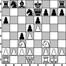 Partie-Notation im PGN-Format [Event "D.A. - Schnell 1"] [Site "www.mySchach.de"] [Date "2008.06.09"] [Round "1"] [White "Knight"] [Black "ujack1961"] [ECO "D00"] [WhitemyELO "1230"] [BlackmyELO "1729"] [Result "1-0"] [TimeControl "10/864000"] [WhiteDays "07"] [BlackDays "10"] [MySchachNr "45484"] 1. d4 d5 2. e4 e6 3. Nc3 Nf6 4. e5 Nfd7 5. Nf3 c5 6. Bg5 Be7 7. Bxe7 Qxe7 8. Bb5 a6 9. Ba4 b5 10. Bb3 c4 11. Bxc4 bxc4 12. O-O 1-0 Stellungs-Notation im FEN-Format rnb1k2r/3nqppp/p3p3/3pP3/2pP4/2N2N2/PPPP1PPP/R2Q1RK1 - kq - 1 12 Geschlagene Figuren Weiss: Geschlagene Figuren Schwarz: Klicken Sie auf eine geschlagene Figur um den gewünschten Zug darzustellen!