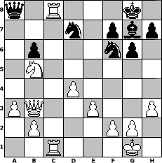 Partie-Notation im PGN-Format [Event "EU Weihnachts-Gipfel Spiele"] [Site "www.mySchach.de"] [Date "2011.12.25"] [Round "1"] [White "Steffi"] [Black "Knight"] [ECO "E61"] [WhitemyELO "1548"] [BlackmyELO "1304"] [Result "1-0"] [TimeControl "10/1728000"] [WhiteDays "42"] [BlackDays "60"] [MySchachNr "78590"] 1. d4 Nf6 2. c4 g6 3. Nc3 Bg7 4. Nf3 d6 5. e3 Bg4 6. Be2 O-O 7. O-O Nc6 8. a3 a5 9. Bd2 d5 10. cxd5 Nb8 11. Qb3 b6 12. Rac1 Nbd7 13. h3 Bxf3 14. Bxf3 a4 15. Nxa4 Nb8 16. d6 Ra7 17. dxe7 Qxe7 18. Bb4 Qd8 19. Bxf8 Bxf8 20. Nc3 Bg7 21. Nb5 Ra6 22. Rxc7 Nbd7 23. Rfc1 Ra8 24. Bxa8 Qxa8 25. Rc8+ 1-0 Stellungs-Notation im FEN-Format q1R3k1/3n1pbp/1p3np1/1N6/3P4/PQ2P2P/1P3PP1/2R3K1 - - - 1 25 Geschlagene Figuren Weiss: Geschlagene Figuren Schwarz: Klicken Sie auf eine geschlagene Figur um den gewünschten Zug darzustellen!