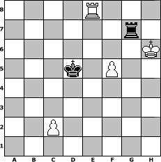 Partie-Notation im PGN-Format [Event "Trainingslager II"] [Site "www.mySchach.de"] [Date "2011.05.24"] [Round "2"] [White "Duschgel"] [Black "UPS"] [ECO "A13"] [WhitemyELO "1571"] [BlackmyELO "1722"] [Result "1-0"] [TimeControl "10/1728000"] [WhiteDays "19"] [BlackDays "00"] [MySchachNr "74177"] 1. c4 e6 2. g3 Nc6 3. Bg2 d5 4. Nf3 Nf6 5. b3 Be7 6. Bb2 O-O 7. O-O h6 8. d3 a6 9. Nbd2 b5 10. e4 dxe4 11. Nxe4 b4 12. Nxf6+ Bxf6 13. Bxf6 Qxf6 14. d4 Rb8 15. d5 exd5 16. cxd5 Ne7 17. Rc1 Qd6 18. Nd4 Bb7 19. Nc6 Rbe8 20. Rc4 Bxc6 21. dxc6 Rd8 22. Qxd6 Rxd6 23. Rxb4 Nxc6 24. Rc4 Ne5 25. Rxc7 Rd2 26. Rc5 f6 27. Ra5 Rd6 28. Bb7 Rb8 29. Rxa6 Rxa6 30. Bxa6 Ra8 31. Bc4+ Nxc4 32. bxc4 Rxa2 33. Rc1 Kf8 34. h4 Ke7 35. g4 Kd6 36. Kg2 Re2 37. c5+ Kc6 38. Kf3 Re5 39. Kf4 g5+ 40. Kg3 Rd5 41. hxg5 hxg5 42. Kf3 Rd4 43. Rc3 Rf4+ 44. Kg3 f5 45. gxf5 Rxf5 46. f3 Re5 47. Kg4 Rd5 48. Kh5 Kd7 49. Kg6 Re5 50. Rc1 Re3 51. Rf1 Re5 52. Rg1 Re3 53. Rg3 Kc6 54. Kxg5 Kxc5 55. Kf4 Re8 56. Rg6 Kd5 57. Kg5 Rf8 58. f4 Rf7 59. f5 Rf8 60. Re6 Rf7 61. Re8 Rg7+ 62. Kh6 1-0 Stellungs-Notation im FEN-Format 4R3/6r1/7K/3k1P2/8/8/2P5/8 - - - 6 62 Geschlagene Figuren Weiss: Geschlagene Figuren Schwarz: Klicken Sie auf eine geschlagene Figur um den gewünschten Zug darzustellen!