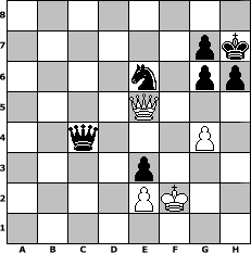 Partie-Notation im PGN-Format [Event "Die Wikinger XXI. - Qualifikation"] [Site "www.mySchach.de"] [Date "2025.08.08"] [Round "1"] [White "Hobbykegler"] [Black "Seneca"] [ECO "B07"] [WhitemyELO "1018"] [BlackmyELO "1528"] [Result "0-1"] [TimeControl "10/2592000"] [WhiteDays "28"] [BlackDays "30"] [MySchachNr "133572"] 1. e4 d6 2. Nf3 e5 3. Bc4 Be7 4. O-O Nf6 5. Nc3 O-O 6. Nd5 Nxd5 7. Bxd5 c6 8. Bb3 Bg4 9. h3 Bh5 10. g4 Bg6 11. d3 h6 12. a4 Nd7 13. h4 Bxh4 14. c4 a6 15. c5 Nxc5 16. Bc4 b5 17. axb5 axb5 18. Rxa8 Bxf2+ 19. Rxf2 Qxa8 20. b4 Nd7 21. Bb2 bxc4 22. dxc4 Qb8 23. Nh4 Qxb4 24. Nxg6 fxg6 25. Rxf8+ Nxf8 26. Bc1 Ne6 27. Bd2 Qxc4 28. Kf2 d5 29. exd5 cxd5 30. Qf3 e4 31. Qg3 d4 32. Qb8+ Kh7 33. Qe5 e3+ 34. Bxe3 dxe3+ 0-1 Stellungs-Notation im FEN-Format 8/6pk/4n1pp/4Q3/2q3P1/4p3/4PK2/8 - - - 0 35 Geschlagene Figuren Weiss: Geschlagene Figuren Schwarz: Klicken Sie auf eine geschlagene Figur um den gewünschten Zug darzustellen!