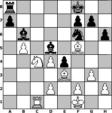 Partie-Notation im PGN-Format [Event "Katalanisch"] [Site "www.mySchach.de"] [Date "2012.06.11"] [Round "1"] [White "sprinterde"] [Black "lasker"] [ECO "E00"] [WhitemyELO "1726"] [BlackmyELO "1417"] [Result "1-0"] [TimeControl "10/1728000"] [WhiteDays "20"] [BlackDays "00"] [MySchachNr "82132"] 1. d4 Nf6 2. c4 e6 3. g3 d5 4. Nc3 h6 5. Bg2 Be7 6. cxd5 Nxd5 7. Qb3 O-O 8. Nxd5 exd5 9. Bf4 c6 10. Nf3 Nd7 11. O-O Nf6 12. Ne5 Bd6 13. Rfe1 Re8 14. e4 Be6 15. Qxb7 Qc7 16. Qxc7 Bxc7 17. Rac1 dxe4 18. Rxc6 Bb6 19. Be3 Rec8 20. Rec1 Rxc6 21. Rxc6 Bd5 22. Rc2 Bxa2 23. b4 Bd5 24. b5 Kf8 25. Bh3 Ke7 26. Nc6+ Ke8 27. Rc1 Kf8 28. Ne5 Ke8 29. Kf1 Ke7 30. Bf5 Kf8 31. Nc4 1-0 Stellungs-Notation im FEN-Format r4k2/p4pp1/1b3n1p/1P1b1B2/2NPp3/4B1P1/3P1P1P/2R2K2 - - - 14 31 Geschlagene Figuren Weiss: Geschlagene Figuren Schwarz: Klicken Sie auf eine geschlagene Figur um den gewünschten Zug darzustellen!