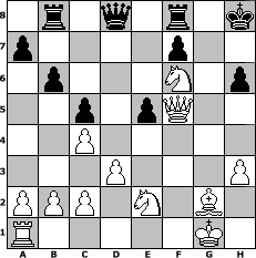 Partie-Notation im PGN-Format [Event "Einstand"] [Site "www.mySchach.de"] [Date "2010.12.10"] [Round "2"] [White "Duschgel"] [Black "Master1"] [ECO "A36"] [WhitemyELO "1549"] [BlackmyELO "1328"] [Result "1-0"] [TimeControl "10/864000"] [WhiteDays "10"] [BlackDays "10"] [MySchachNr "70488"] 1. c4 c5 2. Nc3 Nc6 3. g3 g6 4. Bg2 Bg7 5. e4 Nf6 6. Nge2 O-O 7. O-O Ne5 8. d3 d6 9. f4 Nc6 10. h3 e6 11. g4 Bd7 12. f5 gxf5 13. exf5 exf5 14. gxf5 Rb8 15. Bf4 Bxf5 16. Bg5 Ne5 17. Rxf5 h6 18. Bh4 Ned7 19. Nd5 b6 20. Qf1 Ne5 21. Bxf6 Bxf6 22. Nxf6+ Kh8 23. Rxe5 dxe5 24. Qf5 1-0 Stellungs-Notation im FEN-Format 1r1q1r1k/p4p2/1p3N1p/2p1pQ2/2P5/3P3P/PPP1N1B1/R5K1 - - - 1 24 Geschlagene Figuren Weiss: Geschlagene Figuren Schwarz: Klicken Sie auf eine geschlagene Figur um den gewünschten Zug darzustellen!