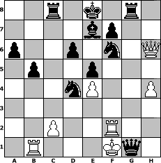 Partie-Notation im PGN-Format [Event "wie w"] [Site "www.mySchach.de"] [Date "2013.11.11"] [Round "1"] [White "MiFie"] [Black "Winston"] [ECO "B20"] [WhitemyELO "1040"] [BlackmyELO "1550"] [Result "0-1"] [TimeControl "10/1728000"] [WhiteDays "20"] [BlackDays "19"] [MySchachNr "91021"] 1. e4 c5 2. d3 h6 3. Nc3 e6 4. Nf3 Nc6 5. Bg5 hxg5 6. Nxg5 Qxg5 7. h4 Qd8 8. Be2 Be7 9. g3 Nd4 10. Bg4 e5 11. O-O Nf6 12. Bh3 a6 13. f4 d6 14. Qd2 Bxh3 15. Rf2 Bg4 16. Raf1 c4 17. dxc4 Qb6 18. Qe3 Qxb2 19. Na4 Qxa2 20. Nc3 Qxc4 21. Rb1 b5 22. f5 Rc8 23. Qg5 Nh5 24. Qxg4 Qxc3 25. f6 Nxf6 26. Qxg7 Rg8 27. Qh6 Qxg3+ 28. Kf1 Qg1# 0-1 Stellungs-Notation im FEN-Format 2r1k1r1/4bp2/p2p1n1Q/1p2p3/3nP2P/8/2P2R2/1R3Kq1 - - - 2 29 Geschlagene Figuren Weiss: Geschlagene Figuren Schwarz: Klicken Sie auf eine geschlagene Figur um den gewünschten Zug darzustellen!