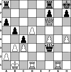 Partie-Notation im PGN-Format [Event "1. Intergalaktische Meisterschaften"] [Site "www.mySchach.de"] [Date "2006.03.07"] [Round "2"] [White "rikilatic"] [Black "alpacino"] [ECO "A01"] [WhitemyELO "1449"] [BlackmyELO "1429"] [Result "1-0"] [TimeControl "10/1728000"] [WhiteDays "19"] [BlackDays "20"] [MySchachNr "23327"] 1. b3 Nf6 2. Bb2 d6 3. Bxf6 exf6 4. e4 Be7 5. Bc4 O-O 6. Qf3 Nd7 7. d4 c5 8. d5 Ne5 9. Qe2 Qa5+ 10. c3 a6 11. f4 Bg4 12. Nf3 Bxf3 13. gxf3 Nxc4 14. Qxc4 b5 15. Qd3 Qb6 16. Nd2 f5 17. h4 Bf6 18. e5 dxe5 19. Qxf5 e4 20. Nxe4 c4 21. Nxf6+ gxf6 22. O-O-O Qe3+ 23. Kc2 Qf2+ 24. Kb1 Qxf3 25. Rhg1+ Kh8 26. Qxf6# 1-0 Stellungs-Notation im FEN-Format r4r1k/5p1p/p4Q2/1p1P4/2p2P1P/1PP2q2/P7/1K1R2R1 - - - 0 26 Geschlagene Figuren Weiss: Geschlagene Figuren Schwarz: Klicken Sie auf eine geschlagene Figur um den gewünschten Zug darzustellen!