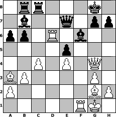 Partie-Notation im PGN-Format [Event "MYCHESS.DE POTENTIAL FINAL TOURNAMENT"] [Site "www.mySchach.de"] [Date "2020.10.03"] [Round "1"] [White "Robert"] [Black "iamnothere"] [ECO "A04"] [WhitemyELO "1688"] [BlackmyELO "1453"] [Result "1-0"] [TimeControl "10/3456000"] [WhiteDays "34"] [BlackDays "40"] [MySchachNr "119438"] 1. Nf3 c5 2. c4 Nc6 3. d4 Nxd4 4. Nxd4 cxd4 5. Qxd4 d6 6. Nc3 e5 7. Qd1 Nf6 8. g3 Be7 9. Bg2 O-O 10. O-O Rb8 11. b3 b6 12. Ba3 a6 13. Qc2 Bb7 14. e4 Qd7 15. Rad1 Rfc8 16. Qd3 Ne8 17. f4 f6 18. fxe5 fxe5 19. Nd5 Bd8 20. Qf3 Nf6 21. Nxf6+ Bxf6 22. Rxd6 Qe7 23. Qg4 1-0 Stellungs-Notation im FEN-Format 1rr3k1/1b2q1pp/pp1R1b2/4p3/2P1P1Q1/BP4P1/P5BP/5RK1 - - - 2 23 Geschlagene Figuren Weiss: Geschlagene Figuren Schwarz: Klicken Sie auf eine geschlagene Figur um den gewünschten Zug darzustellen!