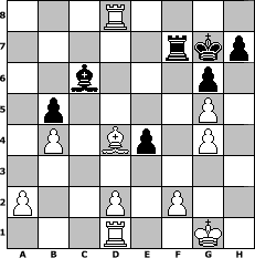 Partie-Notation im PGN-Format [Event "2.HSF-Clubmeisterschaften 2011/12 Gruppe B"] [Site "www.mySchach.de"] [Date "2011.09.01"] [Round "1"] [White "Vahl1"] [Black "Gauss1233"] [ECO "A45"] [WhitemyELO "1623"] [BlackmyELO "1414"] [Result "1-0"] [TimeControl "10/2592000"] [WhiteDays "29"] [BlackDays "08"] [MySchachNr "75978"] 1. d4 Nf6 2. Nc3 g6 3. e4 d6 4. Nf3 Bg7 5. e5 dxe5 6. dxe5 Qxd1+ 7. Nxd1 Nd5 8. Bc4 c6 9. h3 Nc7 10. O-O Nd5 11. Re1 Nb6 12. Ne3 Nxc4 13. Nxc4 b5 14. Na5 c5 15. Nb3 O-O 16. Nxc5 Nd7 17. Nxd7 Bxd7 18. c3 Rac8 19. Be3 f6 20. Bxa7 fxe5 21. Nxe5 Bxe5 22. Rxe5 e6 23. b4 Rxc3 24. Rd1 Rc7 25. Bc5 Rf5 26. Re3 Kf7 27. Rd3 Ke8 28. Ra3 Kf7 29. Ra8 Bc6 30. Rh8 Kg7 31. Bd4+ e5 32. Bb6 Rcf7 33. Rd8 Rg5 34. g4 e4 35. Bd4+ Kh6 36. Be3 Rff5 37. h4 Kg7 38. hxg5 Rf7 39. Bd4+ 1-0 Stellungs-Notation im FEN-Format 3R4/5rkp/2b3p1/1p4P1/1P1Bp1P1/8/P2P1P2/3R2K1 - - - 2 39 Geschlagene Figuren Weiss: Geschlagene Figuren Schwarz: Klicken Sie auf eine geschlagene Figur um den gewünschten Zug darzustellen!
