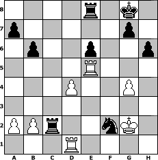 Partie-Notation im PGN-Format [Event "Fr"] [Site "www.mySchach.de"] [Date "2007.03.22"] [Round "2"] [Board "1"] [White "hermtz"] [Black "HPB2005"] [ECO "A46"] [WhitemyELO "1690"] [BlackmyELO "2002"] [Result "0-1"] [TimeControl "10/1728000"] [WhiteDays "20"] [BlackDays "20"] [MySchachNr "33662"] 1. d4 Nf6 2. Nf3 d5 3. e3 c5 4. c3 Nbd7 5. Bd3 Qc7 6. O-O b6 7. Nbd2 Bb7 8. Re1 e6 9. e4 dxe4 10. Nxe4 Be7 11. Bg5 h6 12. Bh4 Nxe4 13. Bxe4 Bxh4 14. Nxh4 Bxe4 15. Rxe4 O-O 16. Qe2 Nf6 17. Re5 cxd4 18. cxd4 Rac8 19. Nf3 Qc6 20. h3 Rfe8 21. Re3 Nd5 22. Ne5 Qc2 23. Qf3 f6 24. Re2 Qf5 25. g4 Qf4 26. Qxf4 Nxf4 27. Re4 fxe5 28. Rxe5 Rc2 29. Rd1 Nxh3+ 30. Kg2 Nxf2 0-1 Stellungs-Notation im FEN-Format 4r1k1/p5p1/1p2p2p/4R3/3P2P1/8/PPr2nK1/3R4 - - - 0 31 Geschlagene Figuren Weiss: Geschlagene Figuren Schwarz: Klicken Sie auf eine geschlagene Figur um den gewünschten Zug darzustellen!