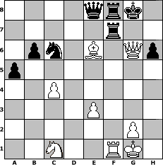 Partie-Notation im PGN-Format [Event "960-Fr"] [Site "www.mySchach.de"] [Date "2016.03.28"] [Round "1"] [White "Erich"] [Black "espero"] [Variant "Fischerrandom"] [SetUp "1"] [FEN "qnnbbrkr/pppppppp/8/8/8/8/PPPPPPPP/QNNBBRKR w KQkq - 0 1"] [WhitemyELO "2106"] [BlackmyELO "1818"] [Result "1-0"] [TimeControl "10/1728000"] [WhiteDays "20"] [BlackDays "05"] [MySchachNr "103090"] 1. d3 c5 2. c4 Nc6 3. b3 e5 4. a3 d6 5. e3 f5 6. b4 Bf6 7. h4 e4 8. Bc3 cxb4 9. axb4 Nxb4 10. dxe4 fxe4 11. Nd2 b6 12. Bg4 Bxc3 13. Qxc3 a5 14. Rh3 Ne7 15. Rg3 Bf7 16. Bh3 Ng6 17. h5 Ne5 18. h6 Bg6 19. Be6+ Rf7 20. f4 exf3 21. Nxf3 O-O 22. Nxe5 dxe5 23. Qxe5 gxh6 24. Qf4 Qe8 25. Qf6 Nc6 26. Rxg6+ hxg6 27. Qxg6+ 1-0 Stellungs-Notation im FEN-Format 4qrk1/5r2/1pn1B1Qp/p7/2P5/4P3/6P1/2N2RK1 - Q - 0 27 Geschlagene Figuren Weiss: Geschlagene Figuren Schwarz: Klicken Sie auf eine geschlagene Figur um den gewünschten Zug darzustellen!