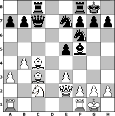 Partie-Notation im PGN-Format [Event "4. HK-Turnier"] [Site "www.mySchach.de"] [Date "2005.01.08"] [Round "2"] [White "Seneca"] [Black "chessmike"] [ECO "E47"] [WhitemyELO "1624"] [BlackmyELO "1839"] [Result "0-1"] [TimeControl "10/2592000"] [WhiteDays "58"] [BlackDays "58"] [MySchachNr "9394"] 1. d4 Nf6 2. c4 e6 3. Nc3 Bb4 4. e3 O-O 5. Bd3 c5 6. Nf3 d5 7. Bd2 cxd4 8. Nxd4 e5 9. Nc2 dxc4 10. Bxc4 Ba5 11. O-O Nc6 12. a3 Bf5 13. b4 Bb6 14. Na4 Rc8 15. Nxb6 Qxb6 16. Bc3 Ne7 17. Qe2 Qc7 0-1 Stellungs-Notation im FEN-Format 2r2rk1/ppq1nppp/5n2/4pb2/1PB5/P1B1P3/2N1QPPP/R4RK1 - - - 4 18 Geschlagene Figuren Weiss: Geschlagene Figuren Schwarz: Klicken Sie auf eine geschlagene Figur um den gewünschten Zug darzustellen!