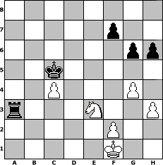 Partie-Notation im PGN-Format [Event "Scottish Open"] [Site "www.mySchach.de"] [Date "2007.10.22"] [Round "1"] [White "bernhard"] [Black "Andylein1989"] [ECO "A00"] [WhitemyELO "1614"] [BlackmyELO "1462"] [Result "1/2-1/2"] [TimeControl "10/864000"] [WhiteDays "38"] [BlackDays "40"] [MySchachNr "39172"] 1. b4 e5 2. b5 d6 3. d4 Bd7 4. e3 exd4 5. exd4 Nf6 6. Nf3 a6 7. bxa6 Nxa6 8. c4 Be7 9. d5 Nc5 10. h3 h6 11. Be3 Nfe4 12. Nfd2 Bf6 13. Nxe4 Bxa1 14. Nxc5 dxc5 15. Bxc5 Bf6 16. Qe2+ Be7 17. a3 b6 18. Bxb6 cxb6 19. d6 Be6 20. dxe7 Qxe7 21. Qe3 Bf5 22. Qxe7+ Kxe7 23. Nc3 Rxa3 24. Nd5+ Kd6 25. Nxb6 Rb8 26. Nd5 Rb2 27. Be2 Ra1+ 28. Bd1 Bc2 29. Ne3 Rbb1 30. Kd2 Bxd1 31. Rxd1 Rxd1+ 32. Nxd1 Kc5 33. Ne3 Ra2+ 34. Ke1 g6 35. g4 Ra3 36. Kf1 1/2-1/2 Stellungs-Notation im FEN-Format 8/5p2/6pp/2k5/2P3P1/r3N2P/5P2/5K2 - - - 2 36 Geschlagene Figuren Weiss: Geschlagene Figuren Schwarz: Klicken Sie auf eine geschlagene Figur um den gewünschten Zug darzustellen!