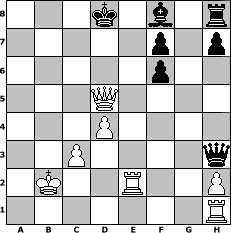 Partie-Notation im PGN-Format [Event "Trainingslager II"] [Site "www.mySchach.de"] [Date "2011.05.24"] [Round "2"] [White "reisender"] [Black "Duschgel"] [ECO "B15"] [WhitemyELO "1322"] [BlackmyELO "1571"] [Result "1-0"] [TimeControl "10/1728000"] [WhiteDays "20"] [BlackDays "20"] [MySchachNr "74135"] 1. e4 c6 2. d4 d5 3. Nc3 g6 4. exd5 cxd5 5. Qf3 Nf6 6. Bg5 Bg4 7. Qg3 Bf5 8. Bxf6 exf6 9. O-O-O Nc6 10. Nge2 Nb4 11. Rd2 Bh6 12. f4 Qc7 13. a3 a5 14. axb4 axb4 15. Nb1 Ra1 16. Qb3 Bg4 17. Qxb4 Bxe2 18. Rxe2+ Kd8 19. g3 g5 20. c3 gxf4 21. gxf4 Qxf4+ 22. Kc2 Qf5+ 23. Kb3 Rxb1 24. Bh3 Rxb2+ 25. Kxb2 Qxh3 26. Qxb7 Bf8 27. Qxd5+ 1-0 Stellungs-Notation im FEN-Format 3k1b1r/5p1p/5p2/3Q4/3P4/2P4q/1K2R2P/7R - - - 0 27 Geschlagene Figuren Weiss: Geschlagene Figuren Schwarz: Klicken Sie auf eine geschlagene Figur um den gewünschten Zug darzustellen!