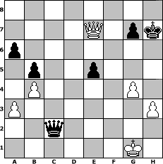 Partie-Notation im PGN-Format [Event "Spring 2017"] [Site "www.mySchach.de"] [Date "2017.03.21"] [Round "1"] [White "sprinterde"] [Black "Joschi"] [ECO "B10"] [WhitemyELO "1731"] [BlackmyELO "1603"] [Result "1/2-1/2"] [TimeControl "10/2592000"] [WhiteDays "118"] [BlackDays "120"] [MySchachNr "107451"] 1. e4 c6 2. f4 e5 3. Nf3 exf4 4. Bc4 d5 5. exd5 cxd5 6. Bb5+ Bd7 7. Qe2+ Be7 8. d4 Nf6 9. Bxf4 O-O 10. Bxd7 Nbxd7 11. O-O Re8 12. Qb5 Nb6 13. Nc3 a6 14. Qd3 Rc8 15. Rae1 Bb4 16. Bg5 Rxe1 17. Nxe1 Be7 18. Nf3 h6 19. Bf4 Bd6 20. Ne5 Qc7 21. Bxh6 Bxe5 22. dxe5 Qxe5 23. Be3 Nbd7 24. Bd4 Qd6 25. h3 b5 26. a3 Re8 27. b4 Ne4 28. Qf3 Re7 29. Qf5 Ndf6 30. Nxe4 Nxe4 31. Qc8+ Kh7 32. Rf5 Qg6 33. Rxd5 Ng3 34. Re5 Rxe5 35. Bxe5 Nf5 36. Qc3 Ne7 37. g4 f6 38. Qc5 fxe5 39. Qxe7 Qxc2 1/2-1/2 Stellungs-Notation im FEN-Format 8/4Q1pk/p7/1p2p3/1P4P1/P6P/2q5/6K1 - - - 0 40 Geschlagene Figuren Weiss: Geschlagene Figuren Schwarz: Klicken Sie auf eine geschlagene Figur um den gewünschten Zug darzustellen!