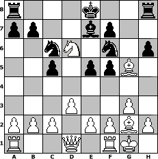 Partie-Notation im PGN-Format [Event "Trainingslager II"] [Site "www.mySchach.de"] [Date "2011.05.24"] [Round "1"] [White "Duschgel"] [Black "Steppenwolf"] [ECO "A30"] [WhitemyELO "1571"] [BlackmyELO "1115"] [Result "1-0"] [TimeControl "10/1728000"] [WhiteDays "20"] [BlackDays "20"] [MySchachNr "74108"] 1. c4 c5 2. g3 d5 3. cxd5 Qxd5 4. Nf3 Nf6 5. Bg2 Nc6 6. Nc3 Bf5 7. O-O Qd6 8. d3 e5 9. Bg5 Be7 10. Nh4 g6 11. Nxf5 gxf5 12. Nb5 h6 13. Nxd6+ 1-0 Stellungs-Notation im FEN-Format r3k2r/pp2bp2/2nN1n1p/2p1ppB1/8/3P2P1/PPP1PPBP/R2Q1RK1 - kq - 0 13 Geschlagene Figuren Weiss: Geschlagene Figuren Schwarz: Klicken Sie auf eine geschlagene Figur um den gewünschten Zug darzustellen!
