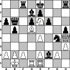 Partie-Notation im PGN-Format [Event "Schach und Schnee schippen"] [Site "www.mySchach.de"] [Date "2021.02.12"] [Round "2"] [White "kalle"] [Black "Ziegert"] [ECO "B75"] [WhitemyELO "1606"] [BlackmyELO "2109"] [Result "0-1"] [TimeControl "10/2592000"] [WhiteDays "83"] [BlackDays "47"] [MySchachNr "121168"] 1. e4 c5 2. Nf3 d6 3. d4 cxd4 4. Nxd4 Nf6 5. Nc3 g6 6. Be3 Bg7 7. f3 a6 8. Qd2 h5 9. Bc4 Nbd7 10. Nd5 Ne5 11. Bb3 Bd7 12. O-O-O b5 13. Nxf6+ Bxf6 14. Bg5 Bg7 15. Bd5 Rc8 16. Kb1 Qb6 17. Qf4 f6 18. Bh4 Bh6 19. Qg3 g5 20. f4 gxh4 21. Qxh4 Ng4 22. Rhe1 Bxf4 23. h3 Be3 24. Ne6 Bf2 0-1 Stellungs-Notation im FEN-Format 2r1k2r/3bp3/pq1pNp2/1p1B3p/4P1nQ/7P/PPP1PbP1/1K1RR3 - k - 3 25 Geschlagene Figuren Weiss: Geschlagene Figuren Schwarz: Klicken Sie auf eine geschlagene Figur um den gewünschten Zug darzustellen!