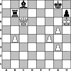 Partie-Notation im PGN-Format [Event "^^Frohes neues Jahr^^"] [Site "www.mySchach.de"] [Date "2007.12.29"] [Round "1"] [White "crca108"] [Black "bruno"] [ECO "B20"] [WhitemyELO "1377"] [BlackmyELO "1517"] [Result "1-0"] [TimeControl "10/864000"] [WhiteDays "49"] [BlackDays "50"] [MySchachNr "41098"] 1. e4 c5 2. Bc4 e6 3. Qf3 Nc6 4. c3 Ne5 5. Qe2 Nf6 6. d4 cxd4 7. cxd4 Nxc4 8. Qxc4 Nxe4 9. Ne2 d5 10. Qb5+ Qd7 11. Qd3 Bb4+ 12. Nd2 O-O 13. O-O Qc6 14. a3 Bxd2 15. Bxd2 Bd7 16. Bb4 Rfe8 17. Rac1 Qb5 18. Qf3 Rac8 19. Nf4 Ng5 20. Qg3 f6 21. Nh5 e5 22. h4 Rxc1 23. Rxc1 Qe2 24. Nxf6+ gxf6 25. hxg5 f5 26. dxe5 Rxe5 27. Re1 Qxe1+ 28. Bxe1 Rxe1+ 29. Kh2 Bb5 30. Qd6 Bc6 31. b4 Re2 32. f3 a6 33. a4 f4 34. Qxf4 Bxa4 35. Qb8+ Be8 36. Qxb7 Re5 37. f4 Rf5 38. g3 d4 39. Qxa6 Rb5 40. Qe6+ Kf8 41. Qd6+ Kg8 42. Qxd4 Kf8 43. Kh3 Bf7 44. Kg4 Be6+ 45. Kh5 Kg8 46. Kh6 Rb7 47. Qe4 Bc8 48. Qc6 1-0 Stellungs-Notation im FEN-Format 2b3k1/1r5p/2Q4K/6P1/1P3P2/6P1/8/8 - - - 12 48 Geschlagene Figuren Weiss: Geschlagene Figuren Schwarz: Klicken Sie auf eine geschlagene Figur um den gewünschten Zug darzustellen!