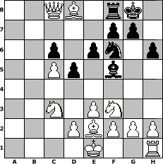 Partie-Notation im PGN-Format [Event "2. Clubmeisterschaft Aljechins Enkel"] [Site "www.mySchach.de"] [Date "2007.03.19"] [Round "1"] [White "reisinger"] [Black "Andylein1989"] [ECO "D06"] [WhitemyELO "1502"] [BlackmyELO "1602"] [Result "1-0"] [TimeControl "10/3456000"] [WhiteDays "80"] [BlackDays "79"] [MySchachNr "33468"] 1. d4 d5 2. c4 h6 3. Nc3 Nf6 4. Bf4 Bf5 5. e3 e6 6. Nf3 c6 7. c5 b6 8. b4 a5 9. a3 axb4 10. axb4 Rxa1 11. Qxa1 Nbd7 12. Be2 bxc5 13. bxc5 Be7 14. Qa6 Qc8 15. Qxc8+ Bd8 16. Bc7 O-O 17. Bxd8 Nxc5 18. dxc5 1-0 Stellungs-Notation im FEN-Format 2QB1rk1/5pp1/2p1pn1p/2Pp1b2/8/2N1PN2/3PBPPP/4K2R - K - 0 18 Geschlagene Figuren Weiss: Geschlagene Figuren Schwarz: Klicken Sie auf eine geschlagene Figur um den gewünschten Zug darzustellen!