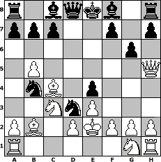 Partie-Notation im PGN-Format [Event "2. Westerw"] [Site "www.mySchach.de"] [Date "2012.01.02"] [Round "1"] [White "nogumo"] [Black "ClaudiaN"] [ECO "A00"] [WhitemyELO "1658"] [BlackmyELO "1736"] [Result "0-1"] [TimeControl "10/1728000"] [WhiteDays "20"] [BlackDays "20"] [MySchachNr "78901"] 1. b4 e5 2. b5 d5 3. Bb2 e4 4. e3 Nf6 5. c4 Nbd7 6. cxd5 Nxd5 7. Nc3 Nc5 8. Qh5 Nb4 9. Bc4 Ncd3+ 10. Ke2 g6 0-1 Stellungs-Notation im FEN-Format r1bqkb1r/ppp2p1p/6p1/1P5Q/1nB1p3/2NnP3/PB1PKPPP/R5NR - kq - 0 11 Geschlagene Figuren Weiss: Geschlagene Figuren Schwarz: Klicken Sie auf eine geschlagene Figur um den gewünschten Zug darzustellen!