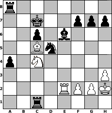 Partie-Notation im PGN-Format [Event "Herbst 2014"] [Site "www.mySchach.de"] [Date "2014.09.08"] [Round "1"] [White "miu"] [Black "haggard"] [ECO "B22"] [WhitemyELO "1633"] [BlackmyELO "1967"] [Result "0-1"] [TimeControl "10/2592000"] [WhiteDays "118"] [BlackDays "090"] [MySchachNr "95811"] 1. e4 c5 2. c3 d5 3. exd5 Qxd5 4. d4 cxd4 5. cxd4 e5 6. Be3 Bb4+ 7. Nc3 Nc6 8. Nf3 exd4 9. Be2 dxc3 10. O-O Qxd1 11. Rfxd1 cxb2 12. Rab1 Bc3 13. Bd3 Bg4 14. Be4 Nge7 15. Bc5 Be6 16. Rd3 Bxa2 17. Bxc6+ bxc6 18. Rxc3 Bxb1 19. Rb3 Be4 20. Nd2 Bd5 21. Rxb2 a5 22. Nb1 a4 23. Re2 Be6 24. h3 Nd5 25. Na3 Kd7 26. Nc4 Rhb8 27. Ne5+ Kc7 28. Nc4 Rb1+ 29. Kh2 Rc1 0-1 Stellungs-Notation im FEN-Format r7/2k2ppp/2p1b3/2Bn4/p1N5/7P/4RPPK/2r5 - - - 11 30 Geschlagene Figuren Weiss: Geschlagene Figuren Schwarz: Klicken Sie auf eine geschlagene Figur um den gewünschten Zug darzustellen!