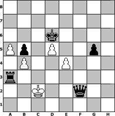 Partie-Notation im PGN-Format [Event "Turnier in den M"] [Site "www.mySchach.de"] [Date "2014.02.19"] [Round "1"] [White "borsti"] [Black "Achimkogge"] [ECO "C40"] [WhitemyELO "1229"] [BlackmyELO "1436"] [Result "0-1"] [TimeControl "10/2592000"] [WhiteDays "30"] [BlackDays "30"] [MySchachNr "93110"] 1. e4 e5 2. Nf3 d5 3. exd5 Qxd5 4. Nc3 Qe6 5. Bb5+ c6 6. Ba4 Qg4 7. Nxe5 Qxg2 8. Qf3 Qxf3 9. Nxf3 Nf6 10. d3 Bd6 11. Be3 O-O 12. O-O-O Bg4 13. Rhg1 Bxf3 14. Rde1 Re8 15. Bg5 Rxe1+ 16. Rxe1 Nbd7 17. Ne2 Re8 18. Kd2 h6 19. Bxf6 Nxf6 20. Nd4 Bf4+ 21. Re3 Bxe3+ 22. fxe3 Bd5 23. c4 Bg2 24. Bd1 g6 25. b4 Ng4 26. Bxg4 h5 27. Bf3 Bxf3 28. Nxf3 f6 29. h4 a6 30. d4 Re4 31. Kd3 Rg4 32. d5 cxd5 33. cxd5 Kf8 34. e4 Ke7 35. Kd4 Kd6 36. a4 b6 37. a5 b5 38. Ne1 Rxh4 39. Nd3 Rh1 40. Nc5 Rd1+ 41. Ke3 g5 42. Nxa6 h4 43. Nc5 Ra1 44. Kd4 h3 45. Nd3 h2 46. Nf2 Ra2 47. Ng4 h1=Q 48. Nxf6 Qg1+ 49. Kd3 Ra3+ 50. Kc2 Qf2+ 51. Kb1 Qxf6 52. Kc2 Qf2+ 0-1 Stellungs-Notation im FEN-Format 8/8/3k4/Pp1P2p1/1P2P3/r7/2K2q2/8 - - - 2 53 Geschlagene Figuren Weiss: Geschlagene Figuren Schwarz: Klicken Sie auf eine geschlagene Figur um den gewünschten Zug darzustellen!
