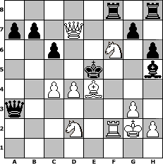 Partie-Notation im PGN-Format [Event "unter uns Nr. 22"] [Site "www.mySchach.de"] [Date "2014.09.16"] [Round "1"] [White "beowulf"] [Black "borsti"] [ECO "A20"] [WhitemyELO "1392"] [BlackmyELO "1269"] [Result "1-0"] [TimeControl "10/864000"] [WhiteDays "29"] [BlackDays "40"] [MySchachNr "95965"] 1. c4 e5 2. g3 d5 3. Bg2 d4 4. e3 Bc5 5. exd4 Bxd4 6. d3 h6 7. Qe2 f6 8. Qh5+ Kf8 9. Bd5 Qe7 10. Bd2 Bxb2 11. Bc3 Bxa1 12. Bxa1 c6 13. Be4 Nd7 14. f4 Qc5 15. Nf3 Qe3+ 16. Kf1 Qc1+ 17. Kg2 Qc2+ 18. Nbd2 Qxa2 19. fxe5 Nxe5 20. Bxe5 fxe5 21. Rf1 Nf6 22. Rf2 Bg4 23. Qg6 Bh5 24. Qf5 Re8 25. Nxe5 Qa3 26. Nd7+ Ke7 27. Nxf6 Ref8 28. Qe5+ Kd8 29. Qb8+ Ke7 30. Qc7+ Ke6 31. Qd7+ Ke5 32. d4# 1-0 Stellungs-Notation im FEN-Format 5r1r/pp1Q2p1/2p2N1p/4k2b/2PPB3/q5P1/3N1RKP/8 - - - 0 32 Geschlagene Figuren Weiss: Geschlagene Figuren Schwarz: Klicken Sie auf eine geschlagene Figur um den gewünschten Zug darzustellen!
