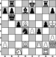 Partie-Notation im PGN-Format [Event "1.FC 960-Clubturnier 2012"] [Site "www.mySchach.de"] [Date "2012.01.07"] [Round "1"] [White "stefun"] [Black "Peterlie77 (C)"] [Variant "Fischerrandom"] [SetUp "1"] [FEN "nrbnkbrq/pppppppp/8/8/8/8/PPPPPPPP/NRBNKBRQ w KQkq - 0 1"] [WhitemyELO "1323"] [BlackmyELO "1992"] [Result "0-1"] [TimeControl "10/2592000"] [WhiteDays "09"] [BlackDays "25"] [MySchachNr "79006"] 1. Nc3 g6 2. e4 d6 3. Nb3 c5 4. d3 Nc6 5. h3 Nb4 6. Kd1 Bg7 7. Bf4 Bxc3 8. bxc3 Qxc3 9. Bd2 Qxc2+ 10. Ke2 Qxd3+ 11. Kd1 Qxb1+ 12. Nc1 Bd7 13. Ke1 Nc2+ 14. Kd1 Ba4 15. Ke2 Nd4+ 16. Ke3 Nb6 17. Qh2 f5 18. Bd3 Nc4+ 19. Kf4 g5+ 20. Kg3 Qb2 21. Bxc4 f4+ 22. Kg4 d5 23. Bxd5 Bd7+ 24. Kh5 Qb6 0-1 Stellungs-Notation im FEN-Format 1r2k1r1/pp1bp2p/1q6/2pB2pK/3nPp2/7P/P2B1PPQ/2N3R1 - kq - 3 25 Geschlagene Figuren Weiss: Geschlagene Figuren Schwarz: Klicken Sie auf eine geschlagene Figur um den gewünschten Zug darzustellen!