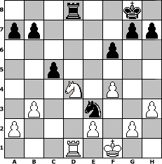 Partie-Notation im PGN-Format [Event "Trainingslager II"] [Site "www.mySchach.de"] [Date "2011.05.24"] [Round "1"] [White "reisender"] [Black "Vahl1"] [ECO "C42"] [WhitemyELO "1322"] [BlackmyELO "1609"] [Result "0-1"] [TimeControl "10/1728000"] [WhiteDays "20"] [BlackDays "20"] [MySchachNr "74115"] 1. e4 e5 2. Nf3 Nf6 3. Bc4 Nxe4 4. Nxe5 Qe7 5. d4 Nd6 6. Nd2 Nc6 7. O-O Nxc4 8. Nexc4 Nxd4 9. Re1 Ne6 10. b3 Qd8 11. Bb2 d5 12. Ne5 f6 13. Nef3 Bc5 14. c4 O-O 15. cxd5 Qxd5 16. Rc1 Nf4 17. Ne4 Bb6 18. Rc2 Qxd1 19. Rxd1 Bf5 20. Rc4 Bxe4 21. Rxe4 Rad8 22. Rf1 Nd3 23. Ba3 Bc5 24. Bxc5 Nxc5 25. Re7 Rd7 26. Rxd7 Nxd7 27. Rd1 Ne5 28. Nd4 Rd8 29. Kf1 c5 30. f4 Ng4 31. h3 Ne3+ 0-1 Stellungs-Notation im FEN-Format 3r2k1/pp4pp/5p2/2p5/3N1P2/1P2n2P/P3P1P1/3R1K2 - - - 1 32 Geschlagene Figuren Weiss: Geschlagene Figuren Schwarz: Klicken Sie auf eine geschlagene Figur um den gewünschten Zug darzustellen!