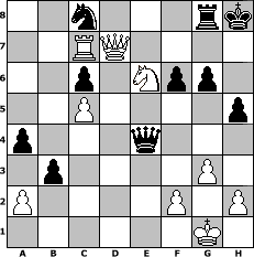 Partie-Notation im PGN-Format [Event "Katalanisch"] [Site "www.mySchach.de"] [Date "2012.06.11"] [Round "1"] [White "kari6katz"] [Black "sprinterde"] [ECO "E01"] [WhitemyELO "1780"] [BlackmyELO "1726"] [Result "1/2-1/2"] [TimeControl "10/1728000"] [WhiteDays "20"] [BlackDays "20"] [MySchachNr "82159"] 1. d4 Nf6 2. c4 e6 3. g3 d5 4. Bg2 Bb4+ 5. Bd2 Bxd2+ 6. Nxd2 O-O 7. Ngf3 dxc4 8. Rc1 b5 9. Ne5 Nd5 10. O-O f6 11. Nef3 c6 12. Ne4 Na6 13. b3 cxb3 14. Qxb3 Qb6 15. Nc5 Nxc5 16. dxc5 Qc7 17. e4 Ne7 18. Rfe1 a6 19. Bh3 a5 20. Bxe6+ Kh8 21. Bxc8 Qxc8 22. Nd4 a4 23. Qe3 Re8 24. Qf3 Rd8 25. Rcd1 Qb8 26. Qg4 Qe5 27. Ne6 Rg8 28. Re3 Ra7 29. Red3 h5 30. Qe2 g6 31. Rd6 Qc3 32. Rd7 Rxd7 33. Rxd7 Nc8 34. Rc7 b4 35. Qd1 b3 36. Qd7 Qe1+ 37. Kg2 Qxe4+ 38. Kg1 1/2-1/2 Stellungs-Notation im FEN-Format 2n3rk/2RQ4/2p1Npp1/2P4p/p3q3/1p4P1/P4P1P/6K1 - - - 1 38 Geschlagene Figuren Weiss: Geschlagene Figuren Schwarz: Klicken Sie auf eine geschlagene Figur um den gewünschten Zug darzustellen!
