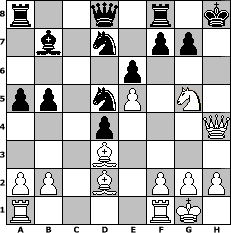 Partie-Notation im PGN-Format [Event "Herbst 2014"] [Site "www.mySchach.de"] [Date "2014.09.08"] [Round "1"] [White "orion"] [Black "Caligula"] [ECO "D06"] [WhitemyELO "1684"] [BlackmyELO "1355"] [Result "1-0"] [TimeControl "10/2592000"] [WhiteDays "60"] [BlackDays "55"] [MySchachNr "95797"] 1. d4 d5 2. c4 Nf6 3. cxd5 Nxd5 4. e4 Nf6 5. Nc3 e6 6. Nf3 c6 7. Bd3 Nbd7 8. O-O Be7 9. Qc2 b5 10. Bd2 O-O 11. e5 Nd5 12. Bxh7+ Kh8 13. Ne4 Bb7 14. Neg5 a5 15. Qe4 Bxg5 16. Nxg5 c5 17. Qh4 cxd4 18. Bd3+ 1-0 Stellungs-Notation im FEN-Format r2q1r1k/1b1n1pp1/4p3/pp1nP1N1/3p3Q/3B4/PP1B1PPP/R4RK1 - - - 1 18 Geschlagene Figuren Weiss: Geschlagene Figuren Schwarz: Klicken Sie auf eine geschlagene Figur um den gewünschten Zug darzustellen!