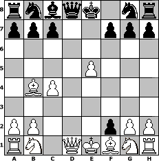 | Partie-Notation im PGN-Format [Event "Schach f"] [Site "www.mySchach.de"] [Date "2008.11.01"] [Round "1"] [Board "2"] [White "Seneca"] [Black "Papale"] [ECO "D08"] [WhitemyELO "1457"] [BlackmyELO "1778"] [Result "0-1"] [TimeControl "10/2592000"] [WhiteDays "23"] [BlackDays "28"] [MySchachNr "49330"] 1. d4 d5 2. c4 e5 3. dxe5 d4 4. e3 Bb4+ 5. Bd2 dxe3 6. Bxb4 exf2+ 0-1 Stellungs-Notation im FEN-Format rnbqk1nr/ppp2ppp/8/4P3/1BP5/8/PP3pPP/RN1QKBNR - KQkq - 0 7 Geschlagene Figuren Weiss:                              Geschlagene Figuren Schwarz:                               Klicken Sie auf eine geschlagene Figur um den gewünschten Zug darzustellen!