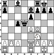 Partie-Notation im PGN-Format [Event "1. Weltmeisterschaft @ myschach.de"] [Site "www.mySchach.de"] [Date "2006.09.15"] [Round "2"] [White "HPB2005"] [Black "Greenhorn"] [ECO "A30"] [WhitemyELO "1988"] [BlackmyELO "1493"] [Result "1-0"] [TimeControl "10/2592000"] [WhiteDays "64"] [BlackDays "85"] [MySchachNr "28521"] 1. c4 c5 2. Nf3 d6 3. d4 b6 4. dxc5 bxc5 5. Qd5 Nc6 6. Qxc6+ Bd7 7. Qa6 Nf6 8. e4 Nxe4 9. Na3 e6 10. Nb5 Qb8 11. Bd3 d5 12. O-O Be7 13. Re1 Bc8 14. Qa4 O-O 15. cxd5 Nd6 16. Nxd6 Qxd6 17. Bf4 Qxd5 18. Be4 Bd7 19. Qa6 Bc8 20. Qe2 1-0 Stellungs-Notation im FEN-Format r1b2rk1/p3bppp/4p3/2pq4/4BB2/5N2/PPP1QPPP/R3R1K1 - - - 5 20 Geschlagene Figuren Weiss: ![]() ![]() ![]() ![]() ![]() ![]() ![]() ![]() ![]() ![]() ![]() ![]() ![]() ![]() ![]() Geschlagene Figuren Schwarz: ![]() ![]() ![]() ![]() ![]() ![]() ![]() ![]() ![]() ![]() ![]() ![]() ![]() ![]() ![]() Klicken Sie auf eine geschlagene Figur um den gewünschten Zug darzustellen!
