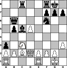 Partie-Notation im PGN-Format [Event "Neujahrsturnier 2014"] [Site "www.mySchach.de"] [Date "2014.01.01"] [Round "1"] [White "muetoe"] [Black "lmilde1 (adv.)"] [ECO "C91"] [WhitemyELO "1778"] [BlackmyELO "1804"] [Result "1/2-1/2"] [TimeControl "10/3456000"] [WhiteDays "105"] [BlackDays "083"] [MySchachNr "91936"] 1. e4 e5 2. Nf3 Nc6 3. Bb5 a6 4. Ba4 Nf6 5. O-O Be7 6. Re1 b5 7. Bb3 d6 8. c3 O-O 9. d4 Bg4 10. Be3 exd4 11. cxd4 Na5 12. Bc2 c5 13. h3 Bxf3 14. Qxf3 cxd4 15. Bxd4 Rc8 16. Bb3 Nc6 17. Qd1 Nxd4 18. Qxd4 d5 19. exd5 Bc5 20. Qd3 Qb6 21. Qd2 a5 22. Nc3 a4 23. Bc2 a3 1/2-1/2 Stellungs-Notation im FEN-Format 2r2rk1/5ppp/1q3n2/1pbP4/8/p1N4P/PPBQPPP1/R3R1K1 - - - 0 24 Geschlagene Figuren Weiss: Geschlagene Figuren Schwarz: Klicken Sie auf eine geschlagene Figur um den gewünschten Zug darzustellen!