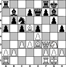 Partie-Notation im PGN-Format [Event "OhneEngine vom Fr"] [Site "www.mySchach.de"] [Date "2010.04.23"] [Round "1"] [White "kuschwl"] [Black "Hannes"] [ECO "B20"] [WhitemyELO "1416"] [BlackmyELO "1414"] [Result "1-0"] [TimeControl "10/2592000"] [WhiteDays "30"] [BlackDays "00"] [MySchachNr "65031"] 1. e4 c5 2. Bc4 e5 3. Qf3 Qe7 4. Nc3 Nf6 5. Nge2 b6 6. Nd5 Nxd5 7. Bxd5 Nc6 8. c3 Bb7 9. Ng3 g6 10. O-O Bg7 11. d3 O-O 12. Be3 a5 13. Qg4 h5 14. Qf3 1-0 Stellungs-Notation im FEN-Format r4rk1/1b1pqpb1/1pn3p1/p1pBp2p/4P3/2PPBQN1/PP3PPP/R4RK1 - - - 1 14 Geschlagene Figuren Weiss: Geschlagene Figuren Schwarz: Klicken Sie auf eine geschlagene Figur um den gewünschten Zug darzustellen!