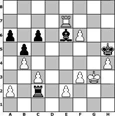 Partie-Notation im PGN-Format [Event "Albspiele 24"] [Site "www.mySchach.de"] [Date "2012.11.07"] [Round "1"] [White "Haki"] [Black "alpacino"] [ECO "C70"] [WhitemyELO "1352"] [BlackmyELO "1314"] [Result "1/2-1/2"] [TimeControl "10/1728000"] [WhiteDays "20"] [BlackDays "20"] [MySchachNr "84943"] 1. e4 e5 2. Nf3 Nc6 3. Bb5 a6 4. Ba4 Bd6 5. Bxc6 dxc6 6. O-O Nf6 7. d3 h6 8. c3 O-O 9. Nbd2 Nh5 10. Nc4 b5 11. Nxd6 cxd6 12. d4 Bb7 13. dxe5 dxe5 14. Nxe5 Qxd1 15. Rxd1 Rad8 16. Be3 Nf6 17. f3 Rfe8 18. b4 Rxd1+ 19. Rxd1 Rxe5 20. Bd4 Re8 21. Bxf6 gxf6 22. Rd6 Kg7 23. h4 f5 24. exf5 h5 25. g4 Re1+ 26. Kf2 Rc1 27. f6+ Kg6 28. Rd7 Rc2+ 29. Kg3 Bc8 30. gxh5+ Kxh5 31. Rxf7 Be6 32. Re7 1/2-1/2 Stellungs-Notation im FEN-Format 8/4R3/p1p1bP2/1p5k/1P5P/2P2PK1/P1r1P3/8 - - - 2 32 Geschlagene Figuren Weiss: Geschlagene Figuren Schwarz: Klicken Sie auf eine geschlagene Figur um den gewünschten Zug darzustellen!