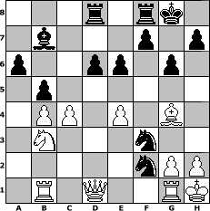 Partie-Notation im PGN-Format [Event "Vorrunde Wikingermeisterschaft Gruppe 2"] [Site "www.mySchach.de"] [Date "2006.03.29"] [Round "1"] [White "Master1"] [Black "chessmike"] [ECO "B20"] [WhitemyELO "2944"] [BlackmyELO "2027"] [Result "0-1"] [TimeControl "10/1728000"] [WhiteDays "60"] [BlackDays "60"] [MySchachNr "23984"] 1. e4 c5 2. Bc4 e6 3. Nf3 Nc6 4. Nc3 a6 5. O-O b5 6. Be2 Bb7 7. a3 d6 8. d3 g6 9. Bg5 Qb6 10. Bf4 Rd8 11. Re1 Bg7 12. b3 Bxc3 13. Bd2 Bxd2 14. Nxd2 Nge7 15. c4 O-O 16. Rb1 Nd4 17. b4 Nec6 18. Bg4 cxb4 19. axb4 Ne5 20. f3 Nxd3 21. Nb3 Nxf3+ 22. Kh1 Qg1+ 23. Rxg1 Nf2# 0-1 Stellungs-Notation im FEN-Format 3r1rk1/1b3p1p/p2pp1p1/1p6/1PP1P1B1/1N3n2/5nPP/1R1Q2RK - - - 1 24 Geschlagene Figuren Weiss: Geschlagene Figuren Schwarz: Klicken Sie auf eine geschlagene Figur um den gewünschten Zug darzustellen!