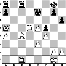 Partie-Notation im PGN-Format [Event "Orang - Utan"] [Site "www.mySchach.de"] [Date "2012.03.06"] [Round "1"] [White "Chaos"] [Black "Haki"] [ECO "A00"] [WhitemyELO "1847"] [BlackmyELO "1312"] [Result "1-0"] [TimeControl "10/2592000"] [WhiteDays "120"] [BlackDays "120"] [MySchachNr "80363"] 1. b4 d5 2. Bb2 Nf6 3. b5 e6 4. Nf3 Bc5 5. e3 O-O 6. a4 Ne4 7. Be2 Bd6 8. O-O Nd7 9. d3 Ng5 10. Nbd2 Nxf3+ 11. Bxf3 Ne5 12. Be2 c6 13. c4 Bc7 14. d4 Ng6 15. Qc2 f5 16. Rad1 Qd6 17. Nf3 Bd7 18. Qc3 Nh4 19. Ne5 Ng6 20. Ba3 Ba5 21. Qxa5 Qxa3 22. Nxd7 Rfd8 23. Ne5 Nxe5 24. dxe5 Qe7 25. bxc6 bxc6 26. cxd5 exd5 27. Rc1 Rdc8 28. f4 c5 29. Rfd1 h6 30. Rxd5 c4 31. Bxc4 1-0 Stellungs-Notation im FEN-Format r1r3k1/p3q1p1/7p/Q2RPp2/P1B2P2/4P3/6PP/2R3K1 - - - 0 31 Geschlagene Figuren Weiss: Geschlagene Figuren Schwarz: Klicken Sie auf eine geschlagene Figur um den gewünschten Zug darzustellen!