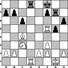 Partie-Notation im PGN-Format [Event "Sweety Tunier"] [Site "www.mySchach.de"] [Date "2006.02.28"] [Round "2"] [White "Robert"] [Black "Falcor"] [ECO "C44"] [WhitemyELO "1500"] [BlackmyELO "1422"] [Result "1-0"] [TimeControl "10/2592000"] [WhiteDays "67"] [BlackDays "72"] [MySchachNr "23034"] 1. e4 e5 2. Nf3 Nc6 3. d4 exd4 4. Bc4 Bc5 5. c3 d6 6. cxd4 Bb4+ 7. Nc3 Nf6 8. Bg5 Bg4 9. O-O Nxd4 10. Qxd4 Bxf3 11. gxf3 h6 12. Bh4 g5 13. Bg3 Bc5 14. Qd2 Rg8 15. e5 dxe5 16. Qxd8+ Rxd8 17. Bxe5 Nd7 18. Rfe1 Nxe5 19. Rxe5+ Kf8 20. Rxc5 c6 21. Rf5 Rg7 22. Rd1 1-0 Stellungs-Notation im FEN-Format 3r1k2/pp3pr1/2p4p/5Rp1/2B5/2N2P2/PP2PP1P/3R2K1 - - - 3 22 Geschlagene Figuren Weiss: Geschlagene Figuren Schwarz: Klicken Sie auf eine geschlagene Figur um den gewünschten Zug darzustellen!