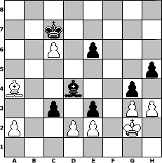 Partie-Notation im PGN-Format [Event "\" Gehirn Jogging A 2 \""] [Site "www.mySchach.de"] [Date "2011.12.23"] [Round "1"] [White "Rixdorfer"] [Black "lotchi"] [ECO "D06"] [WhitemyELO "1549"] [BlackmyELO "1343"] [Result "1/2-1/2"] [TimeControl "10/1728000"] [WhiteDays "20"] [BlackDays "19"] [MySchachNr "78530"] 1. d4 d5 2. c4 c5 3. dxc5 dxc4 4. Qxd8+ Kxd8 5. Nf3 b5 6. Ne5 Be6 7. Nc3 f6 8. Nf3 a6 9. Be3 Nc6 10. Rd1+ Kc7 11. Nd4 Nxd4 12. Rxd4 g5 13. Rd1 Rd8 14. Rxd8 Kxd8 15. g3 Bd7 16. Bg2 e6 17. O-O h6 18. Bb7 a5 19. Rd1 Kc7 20. Ba6 b4 21. Nb5+ Bxb5 22. Bxb5 c3 23. Rd7+ Kc8 24. bxc3 bxc3 25. Ra7 Ne7 26. Ba4 Nd5 27. Rxa5 Nxe3 28. fxe3 Kb7 29. c6+ Kb6 30. Ra8 Bg7 31. Rxh8 Bxh8 32. Kf1 Kc7 33. Ke1 f5 34. Kd1 Be5 35. e4 fxe4 36. Ke1 h5 37. Kf2 g4 38. Kg2 Bd4 39. h3 e3 40. Kh2 Be5 41. Kg2 Bd4 1/2-1/2 Stellungs-Notation im FEN-Format 8/2k5/2P1p3/7p/B2b2p1/2p1p1PP/P2PP1K1/8 - - - 4 42 Geschlagene Figuren Weiss: Geschlagene Figuren Schwarz: Klicken Sie auf eine geschlagene Figur um den gewünschten Zug darzustellen!