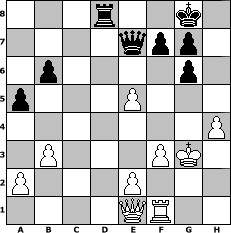 Partie-Notation im PGN-Format [Event "Herbstturnier 2022"] [Site "www.mySchach.de"] [Date "2022.09.26"] [Round "1"] [White "alibengali"] [Black "deepsabel"] [ECO "C29"] [WhitemyELO "1707"] [BlackmyELO "1773"] [Result "1/2-1/2"] [TimeControl "10/1728000"] [WhiteDays "28"] [BlackDays "46"] [MySchachNr "127265"] 1. e4 e5 2. Nc3 Nf6 3. f4 exf4 4. e5 Ng8 5. Nf3 Bb4 6. d4 Ne7 7. Bxf4 O-O 8. Bd3 Ng6 9. Bg5 Be7 10. Bxe7 Qxe7 11. Nd5 Qd8 12. O-O c6 13. Ne3 d5 14. Bxg6 hxg6 15. c4 Be6 16. cxd5 cxd5 17. Rc1 Nc6 18. h4 Qb6 19. b3 a5 20. Rc5 Rac8 21. Nxd5 Bxd5 22. Rxd5 Rfd8 23. Rxd8+ Rxd8 24. Qa1 Nxd4 25. Kh1 Nxf3 26. gxf3 Qb4 27. Qe1 Qe7 28. Kg2 b6 29. Kg3 1/2-1/2 Stellungs-Notation im FEN-Format 3r2k1/4qpp1/1p4p1/p3P3/7P/1P3PK1/P3P3/4QR2 - - - 1 29 Geschlagene Figuren Weiss: Geschlagene Figuren Schwarz: Klicken Sie auf eine geschlagene Figur um den gewünschten Zug darzustellen!