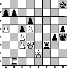 Partie-Notation im PGN-Format [Event "Nimzo-Indisch II"] [Site "www.mySchach.de"] [Date "2012.08.30"] [Round "1"] [White "martinus"] [Black "Erich"] [ECO "E20"] [WhitemyELO "1692"] [BlackmyELO "2027"] [Result "0-1"] [TimeControl "10/1728000"] [WhiteDays "18"] [BlackDays "20"] [MySchachNr "83504"] 1. d4 Nf6 2. c4 e6 3. Nc3 Bb4 4. Bd2 c5 5. a3 Bxc3 6. Bxc3 Ne4 7. Nf3 Nxc3 8. bxc3 Qa5 9. Qd2 d6 10. e3 Nd7 11. Bd3 Nb6 12. O-O Bd7 13. Rfc1 O-O 14. Qc2 g6 15. h4 Bc6 16. e4 Rae8 17. Qd2 f6 18. d5 Bd7 19. h5 Kg7 20. h6+ Kh8 21. Qf4 e5 22. Qg3 Rf7 23. Nd2 Na4 24. Be2 f5 25. exf5 Bxf5 26. Qe3 Qd8 27. Nf3 Rff8 28. Ng5 Qe7 29. Bd1 Nb2 30. Be2 Kg8 31. Ra2 Nd3 32. Rf1 Nf4 33. Qg3 Nxe2+ 34. Rxe2 Bd3 35. Qxd3 Qxg5 36. Qh3 Re7 37. Re3 Rf5 38. Re4 Ref7 39. f3 Qd8 40. Qh4 Qf8 41. Rg4 Kh8 42. Qh3 R7f6 43. a4 g5 44. a5 Rxh6 45. Qg3 Rg6 46. Rb1 Rg7 47. Kf2 Qd8 48. Rb5 h5 49. Re4 g4 50. f4 Rgf7 51. Rb1 Rxf4+ 52. Rxf4 exf4 53. Qd3 Qh4+ 54. Ke2 f3+ 55. gxf3 Rxf3 0-1 Stellungs-Notation im FEN-Format 7k/pp6/3p4/P1pP3p/2P3pq/2PQ1r2/4K3/1R6 - - - 0 56 Geschlagene Figuren Weiss: Geschlagene Figuren Schwarz: Klicken Sie auf eine geschlagene Figur um den gewünschten Zug darzustellen!