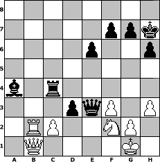 | Partie-Notation im PGN-Format [Event "9erD2"] [Site "www.mySchach.de"] [Date "2011.09.01"] [Round "2"] [White "Joschi"] [Black "espero"] [ECO "C17"] [WhitemyELO "1584"] [BlackmyELO "1689"] [Result "0-1"] [TimeControl "10/3456000"] [WhiteDays "40"] [BlackDays "40"] [MySchachNr "76027"] 1. e4 e6 2. d4 d5 3. Nc3 Bb4 4. e5 c5 5. a3 Ba5 6. Nf3 cxd4 7. Qxd4 Ne7 8. Bf4 Nbc6 9. Bb5 O-O 10. Qd3 Ng6 11. Bg3 Bc7 12. Qe2 Bd7 13. O-O Qb8 14. Rfe1 a6 15. Bxc6 bxc6 16. b4 a5 17. Rab1 axb4 18. axb4 Ra3 19. Qd2 Qa7 20. Rb2 Rb8 21. Reb1 h6 22. h3 Qa6 23. Qe2 Qa7 24. Qe1 c5 25. bxc5 Rxb2 26. Rxb2 Qxc5 27. Ne2 Ra4 28. Nc1 Rc4 29. Nd3 Qa7 30. Qb1 Ba4 31. Ra2 Qb6 32. Rb2 Qc6 33. Nfe1 Ba5 34. Rb8+ Kh7 35. Rb2 d4 36. Kh2 Bxe1 37. Nxe1 Qe4 38. f3 Qf5 39. Kg1 Nxe5 40. Bxe5 Qxe5 41. Nd3 Qe3+ 42. Nf2 d3 0-1 Stellungs-Notation im FEN-Format 8/5ppk/4p2p/8/b1r5/3pqP1P/1RP2NP1/1Q4K1 - - - 0 43 Geschlagene Figuren Weiss:                              Geschlagene Figuren Schwarz:                               Klicken Sie auf eine geschlagene Figur um den gewünschten Zug darzustellen!