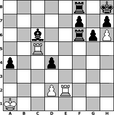 Partie-Notation im PGN-Format [Event "4.Clubmeisterschaft Aljechins Enkel 2010"] [Site "www.mySchach.de"] [Date "2010.12.07"] [Round "1"] [White "Knight"] [Black "Joschi"] [ECO "A45"] [WhitemyELO "1133"] [BlackmyELO "1565"] [Result "0-1"] [TimeControl "10/3456000"] [WhiteDays "200"] [BlackDays "189"] [MySchachNr "70441"] 1. d4 Nf6 2. Nc3 d5 3. e4 dxe4 4. f3 exf3 5. Qxf3 e6 6. Be3 Bb4 7. Nge2 Nd5 8. O-O-O Nxe3 9. Qxe3 O-O 10. h4 Qf6 11. g4 Nd7 12. g5 Qf5 13. h5 Qa5 14. h6 g6 15. Qf3 Qxg5+ 16. Kb1 Nf6 17. Bg2 Rb8 18. Nf4 Bxc3 19. bxc3 Qb5+ 20. Ka1 Qg5 21. Rdg1 Nd7 22. Bf1 Qf6 23. Bd3 c5 24. d5 exd5 25. Kb2 d4 26. c4 b6 27. Qg3 Bb7 28. Rh2 b5 29. cxb5 Bc6 30. a4 a6 31. Nh5 Qe5 32. Qxe5 Nxe5 33. Nf6+ Kh8 34. Re2 Nxd3+ 35. cxd3 axb5 36. Kb1 bxa4+ 37. Ka1 Rb3 38. Rge1 Rxd3 39. Rc1 Rf3 40. Rxc5 Rxf6 0-1 Stellungs-Notation im FEN-Format 5r1k/5p1p/2b2rpP/2R5/p2p4/8/3PR3/K7 - - - 0 41 Geschlagene Figuren Weiss: ![]() ![]() ![]() ![]() ![]() ![]() ![]() ![]() ![]() ![]() ![]() ![]() ![]() ![]() ![]() Geschlagene Figuren Schwarz: ![]() ![]() ![]() ![]() ![]() ![]() ![]() ![]() ![]() ![]() ![]() ![]() ![]() ![]() ![]() Klicken Sie auf eine geschlagene Figur um den gewünschten Zug darzustellen!