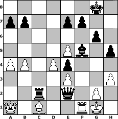 Partie-Notation im PGN-Format [Event "9. Klubmeisterschaft -Die Wikinger-"] [Site "www.mySchach.de"] [Date "2013.04.16"] [Round "1"] [White "Seneca"] [Black "Grubengeist"] [ECO "D00"] [WhitemyELO "1548"] [BlackmyELO "1959"] [Result "0-1"] [TimeControl "10/1728000"] [WhiteDays "19"] [BlackDays "20"] [MySchachNr "87816"] 1. d4 d5 2. e3 c6 3. Bd3 Nf6 4. Nd2 g6 5. f4 Bg7 6. Ngf3 O-O 7. O-O Qc7 8. b3 Nbd7 9. Bb2 Ng4 10. Qe2 Nc5 11. c3 Nxd3 12. Qxd3 Bf5 13. Qe2 Rfe8 14. c4 Nf6 15. h3 h5 16. cxd5 cxd5 17. Rac1 Qa5 18. a4 Rac8 19. Qd1 Rxc1 20. Qxc1 Rc8 21. Qa1 Ne4 22. Nxe4 dxe4 23. Ne5 Bxe5 24. fxe5 Qd2 25. Bc1 Qe2 26. b4 Rc2 0-1 Stellungs-Notation im FEN-Format 6k1/pp2pp2/6p1/4Pb1p/PP1Pp3/4P2P/2r1q1P1/Q1B2RK1 - - - 1 27 Geschlagene Figuren Weiss: Geschlagene Figuren Schwarz: Klicken Sie auf eine geschlagene Figur um den gewünschten Zug darzustellen!