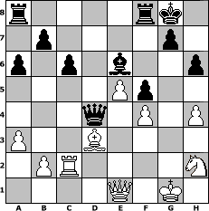 Partie-Notation im PGN-Format [Event "?"] [Site "www.mySchach.de"] [Date "2025.07.23"] [Round "?"] [White "Jonas84"] [Black "peter58"] [ECO "D06"] [WhitemyELO "1508"] [BlackmyELO "1517"] [Result "0-1"] [TimeControl "10/864000"] [WhiteDays "30"] [BlackDays "20"] [MySchachNr "133536"] 1. d4 d5 2. c4 Nf6 3. h3 Nc6 4. Nf3 e6 5. a3 Be7 6. cxd5 Nxd5 7. e4 Nf6 8. Nc3 a6 9. Be2 O-O 10. O-O h6 11. Be3 Re8 12. Rc1 Bf8 13. Nh2 Ne7 14. Qd2 c6 15. e5 Nfd5 16. Nxd5 Nxd5 17. Bd3 f5 18. Rfe1 Nxe3 19. Qxe3 Be7 20. Rc2 Bg5 21. f4 Be7 22. g4 Rf8 23. gxf5 exf5 24. Qg3 Bh4 25. Qe3 Bxe1 26. Qxe1 Be6 27. h4 Qxd4+ 0-1 Stellungs-Notation im FEN-Format r4rk1/1p4p1/p1p1b2p/4Pp2/3q1P1P/P2B4/1PR4N/4Q1K1 - - - 0 28 Geschlagene Figuren Weiss: Geschlagene Figuren Schwarz: Klicken Sie auf eine geschlagene Figur um den gewünschten Zug darzustellen!