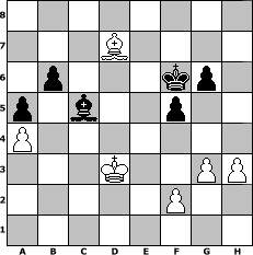 Partie-Notation im PGN-Format [Event "80 Jahre Weltmeister Max Euwe"] [Site "www.mySchach.de"] [Date "2015.07.20"] [Round "1"] [White "Naunhofer"] [Black "miu"] [ECO "E61"] [WhitemyELO "1617"] [BlackmyELO "1598"] [Result "1/2-1/2"] [TimeControl "10/2592000"] [WhiteDays "120"] [BlackDays "120"] [MySchachNr "99749"] 1. d4 Nf6 2. c4 g6 3. Nc3 Bg7 4. Nf3 O-O 5. Bg5 d5 6. e3 a6 7. Bxf6 exf6 8. Nxd5 c5 9. Be2 Nc6 10. dxc5 Qa5+ 11. Qd2 Qxc5 12. b4 Qd6 13. c5 Qd8 14. Rd1 Be6 15. e4 f5 16. exf5 Bxd5 17. Qxd5 Qxd5 18. Rxd5 Nxb4 19. Rd7 Bc3+ 20. Kd1 Rfd8 21. Rxd8+ Rxd8+ 22. Kc1 Rc8 23. fxg6 hxg6 24. Kb1 Rxc5 25. Rc1 Rc7 26. a3 Nd5 27. Ng5 Be5 28. Rxc7 Nxc7 29. Kc2 a5 30. h3 f6 31. Bc4+ Kg7 32. Ne6+ Nxe6 33. Bxe6 Kh6 34. Kd3 Bd6 35. a4 b6 36. Ke4 Kg5 37. g3 f5+ 38. Kd3 Kf6 39. Bd7 Bc5 1/2-1/2 Stellungs-Notation im FEN-Format 8/3B4/1p3kp1/p1b2p2/P7/3K2PP/5P2/8 - - - 4 40 Geschlagene Figuren Weiss: Geschlagene Figuren Schwarz: Klicken Sie auf eine geschlagene Figur um den gewünschten Zug darzustellen!