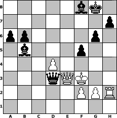 Partie-Notation im PGN-Format [Event "CAISSA.COM IS DEAD TO ME!"] [Site "www.mySchach.de"] [Date "2020.03.28"] [Round "2"] [White "sprinterde"] [Black "UPS"] [ECO "D31"] [WhitemyELO "1670"] [BlackmyELO "1664"] [Result "0-1"] [TimeControl "10/2592000"] [WhiteDays "30"] [BlackDays "28"] [MySchachNr "117731"] 1. d4 d5 2. c4 e6 3. Nc3 Nc6 4. Bf4 a6 5. e3 Bb4 6. a3 Be7 7. Nf3 Nf6 8. c5 Nh5 9. Bg3 b6 10. Be5 O-O 11. cxb6 cxb6 12. Bd3 f6 13. Bg3 Nxg3 14. hxg3 g6 15. e4 dxe4 16. Bxe4 Bb7 17. Qd2 f5 18. Qh6 Rf7 19. Bxc6 Bf8 20. Qe3 Bxc6 21. Ne5 Rc7 22. Rh2 Qe7 23. O-O-O Be8 24. g4 Rac8 25. gxf5 exf5 26. Rd3 Bb5 27. Rd2 Rxc3+ 28. bxc3 Qxa3+ 29. Kd1 Rxc3 30. Nd3 Qb3+ 31. Ke2 Rxd3 32. Rxd3 Qc2+ 33. Kf3 Qxd3 0-1 Stellungs-Notation im FEN-Format 5bk1/7p/pp4p1/1b3p2/3P4/3qQK2/5PPR/8 - - - 0 34 Geschlagene Figuren Weiss: Geschlagene Figuren Schwarz: Klicken Sie auf eine geschlagene Figur um den gewünschten Zug darzustellen!